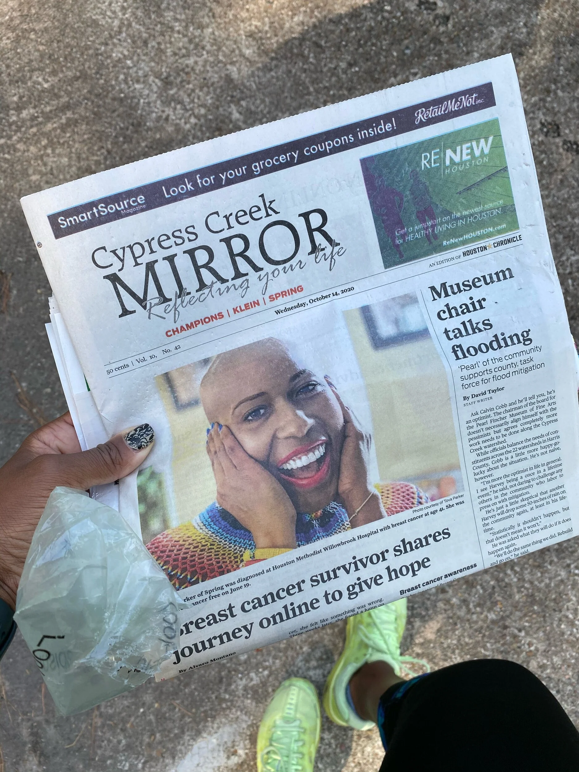On the eve of my birthday, I got up for my normal morning walk. My aunt (who traveled to Texas to support me through my surgery) joined me for a walk around the neighborhood. She walked several steps behind me during most of the walk. I’d frequently turn back to ensure that she was still there. At some point, she called me back to her position. Imagine my surprise when I found that she’d stumbled across a folded newspaper (in a weather bag) displaying a woman’s smile that looked just like mine.