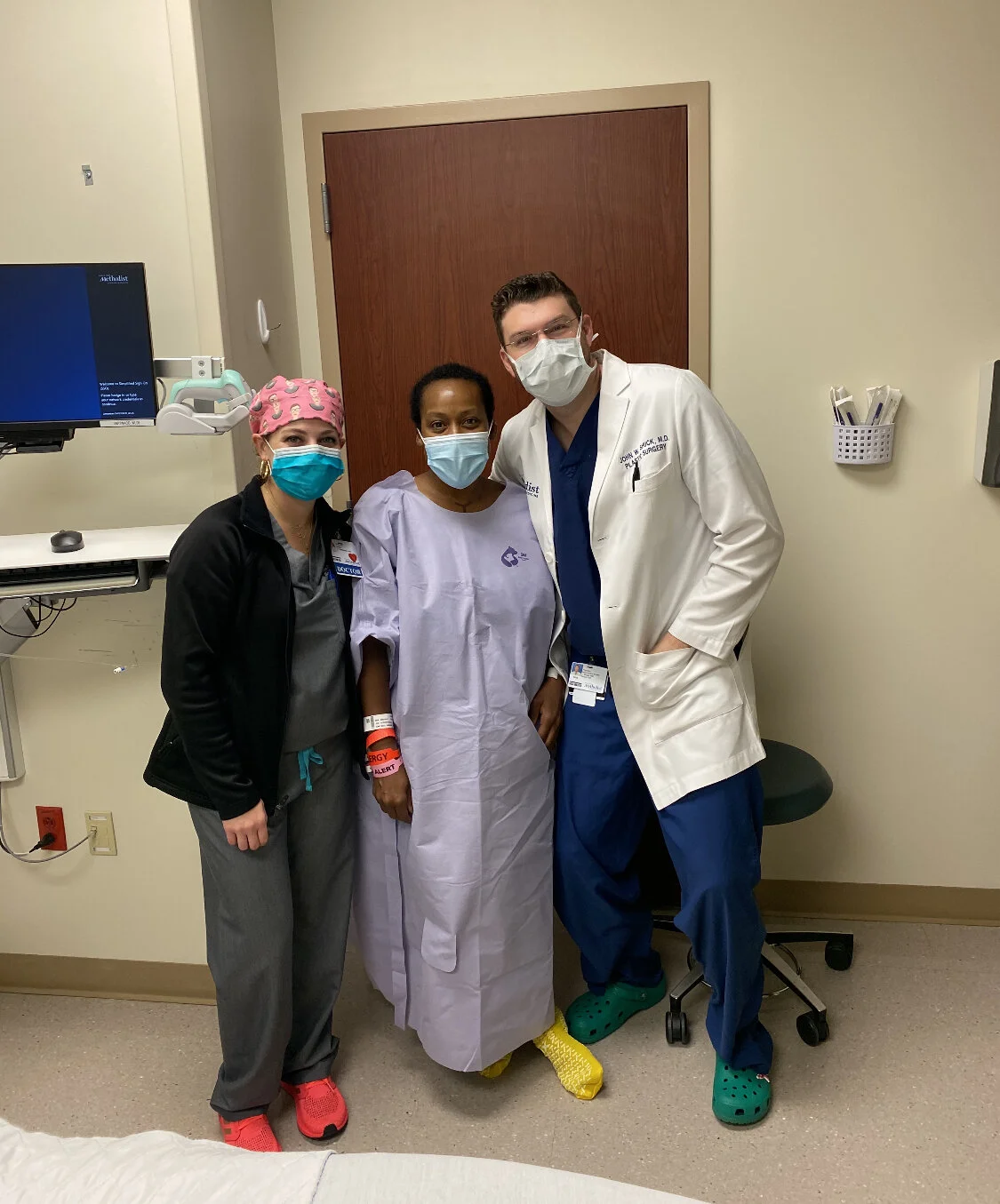 After he was satisfied, I pulled up my gown and like clock-work there was a knock at the door. And guess who it was LT, my breast surgeon. Although she wouldn’t be participating in today’s surgery, she popped in to wish me well and to participate in the photo ops. 🤣